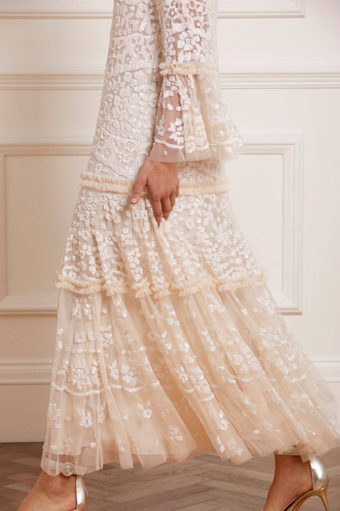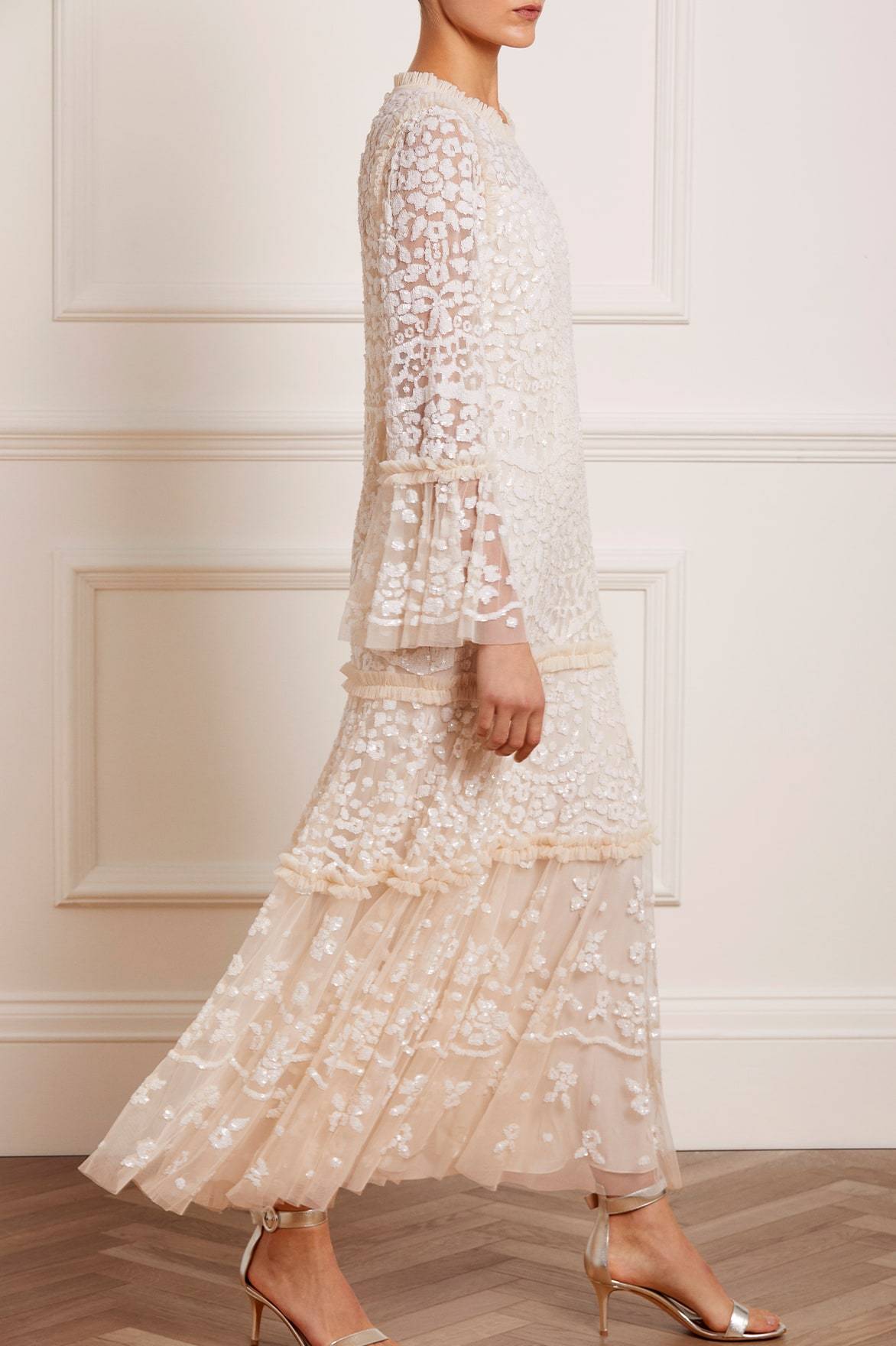 The Annie Sequin Tiered Ankle Gown in Champagne. Adorned with shimmering sequins in a floral and bow artwork, this gown is inspired by a lace tablecloth. Designed with a loose fit silhouette and tiered throughout, creating beautiful movement. Make an effortless statement.