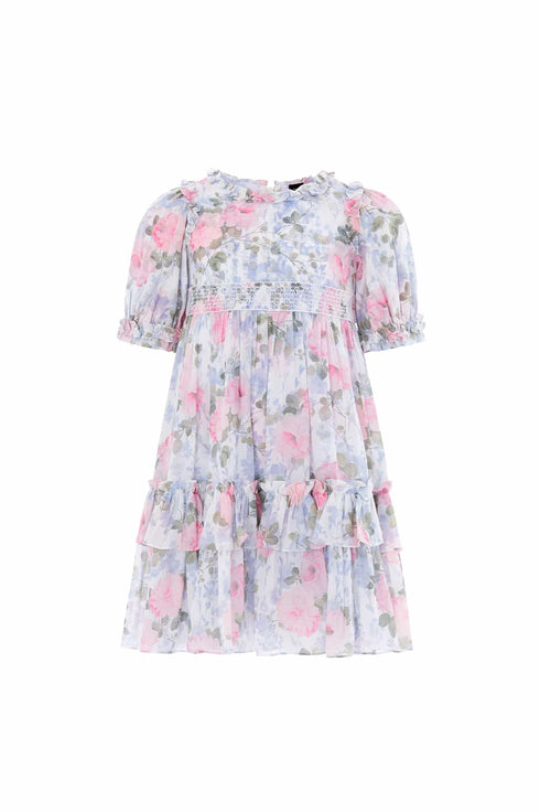NEW SEASON. The Camille’s Garden Chiffon Smocked Kids Dress in Moonshine. Showcases hand-painted floral artwork in delicate pastel hues. With flutter sleeves and a comfortable smocked bodice, this style complements the Camille’s Garden Chiffon Halter-Neck Gown from the womenswear line for a matching mother–daughter look.