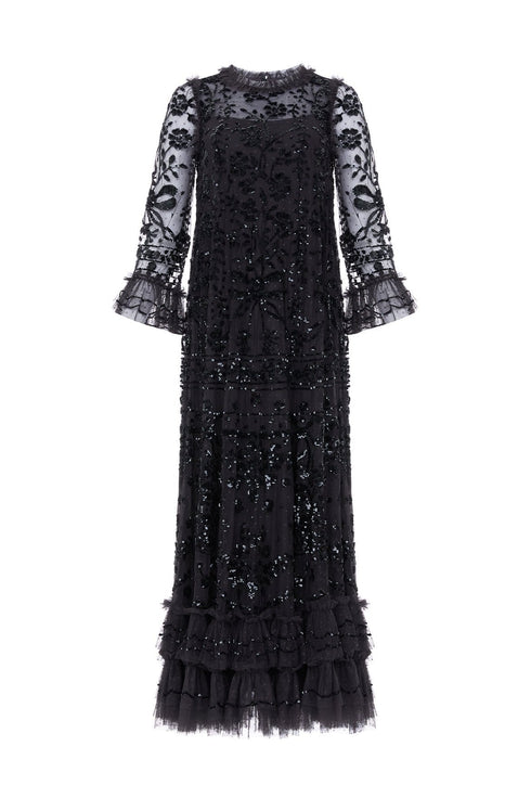 The Celia Long Sleeve Ankle Gown in Graphite. This statement gown is designed with romantic artwork featuring ornate florals, ribbon bows densely filled with shimmering sequins and exquisite detailing. Crafted to produce an effortless, loose fit with soft, playful tulle frills on the hem and cuffs. A key piece in our collection.