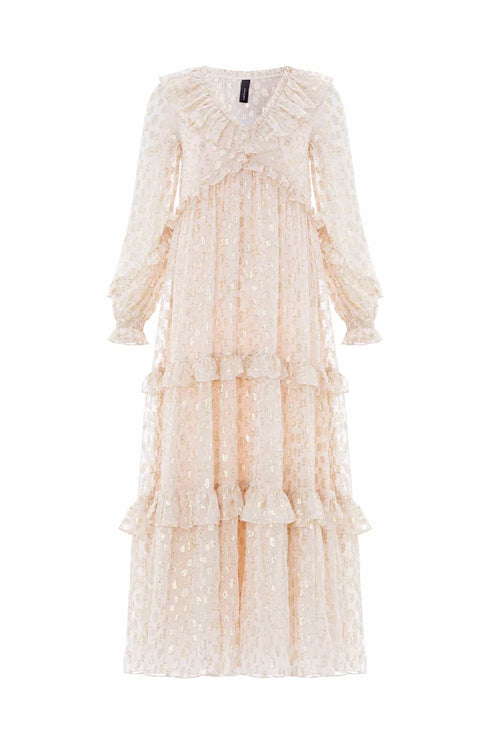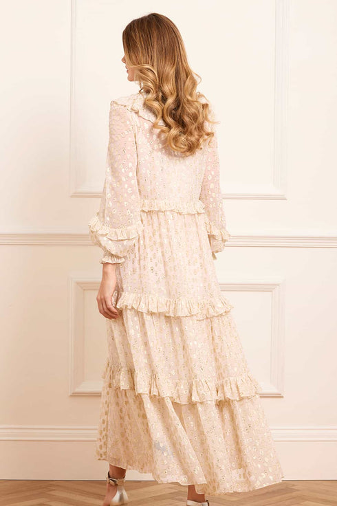 The Cherie Lurex Ankle Gown in Opal. A subtly sparkling style, crafted from fluid georgette with metallic lurex thread. With a softly gathered silhouette and romantic long sleeves, this gown glimmers gently as it catches the light. An elegant option for unforgettable moments.