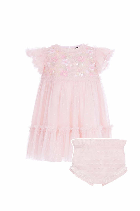 NEW SEASON. The Confetti Bodice Baby Dress in Peony Pink/Multi. This dress features a sequin-embellished bodice with delicate floral motifs and confetti detailing. Soft tulle frills adorn the neckline, bodice, and shoulders, while frilled sleeves create a frothy effect. The gently gathered skirt is finished with playful frills for added volume. Lined in soft cotton voile for comfort, the set includes matching cotton dobby bloomers, delicately edged with frills. The perfect dress for your little one’s upcoming special occasion.