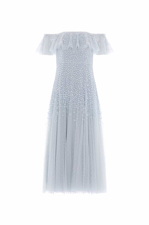 The Dappled Sequin Off-Shoulder Ballerina Dress in French Blue. This ballerina dress features shimmering clustered dot motifs that cascade towards the hem for a radiant effect. Its off-shoulder neckline is adorned with layered circle-cut frills, finished with signature Needle & Thread detailing. The dress is designed with flattering chevron seaming across the hips and a voluminous skirt crafted from layers of net and tulle, creating a dramatic, sweeping hemline. This dress is destined for truly unforgettable moments.