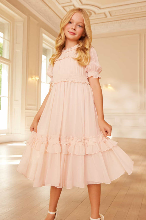 The Emilia Georgette Kids Dress in Opal. A light and flowy silhouette crafted in delicate georgette. With gentle shirring at the waist and sleeves, this piece is perfect for flower girls or any special event. Style with the matching women's Emilia Crepe Dress for a sweet family matching moment.