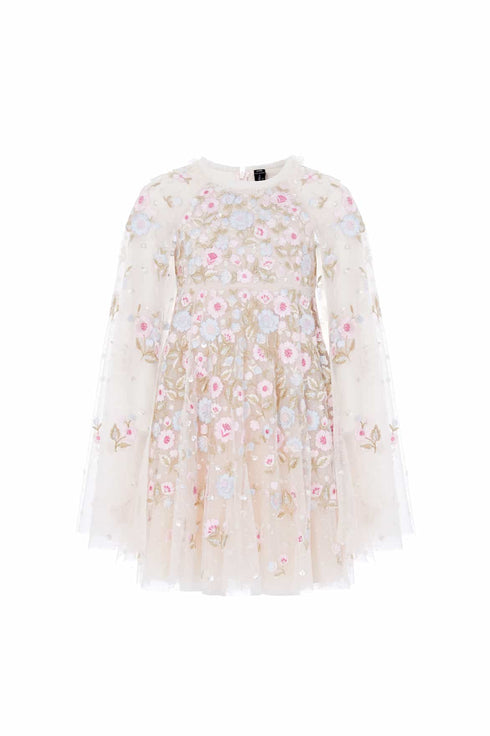 NEW SEASON. The Ethereal Blooms Cape Kids Dress in Cream/Multi. Decorated with beautiful floral embroidery in pastel tones. Featuring a soft cape overlay and a flared skirt, it’s a fairytale piece for little dreamers. This piece mirrors the Ethereal Blooms Cape Sleeve Gown from the womenswear line for a perfectly matching moment.