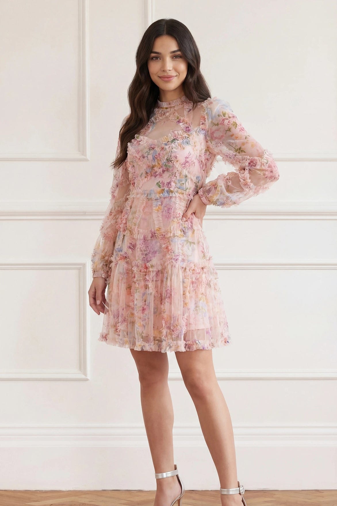 - Floral printed tulle decorated with printed tulle frills across bodice, skirt and sleeves