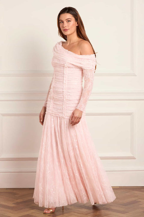 NEW SEASON. The Gigi Lace One-Shoulder Rouched Gown in Seashell. Crafted from delicate lace with subtle ruching through the bodice. This graceful, modern silhouette offers a refined take on romantic evening dressing, perfect for elegant occasions.