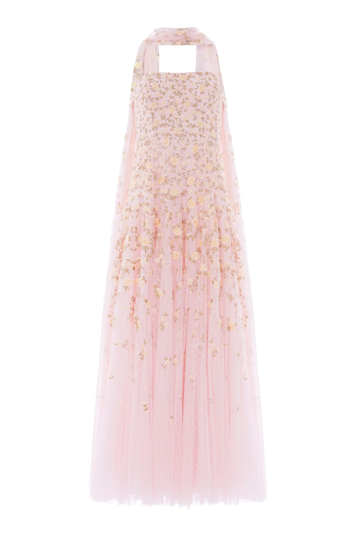 NEW SEASON. The Lea Ditsy Strapless Cape Gown in Peony Pink/Lemon Sorbet. This elegant gown features delicate ditsy florals arranged across a strapless cape silhouette, inspired by antique botanical paintings. Finished with a separate scarf and flowing skirt for a romantic statement finish.