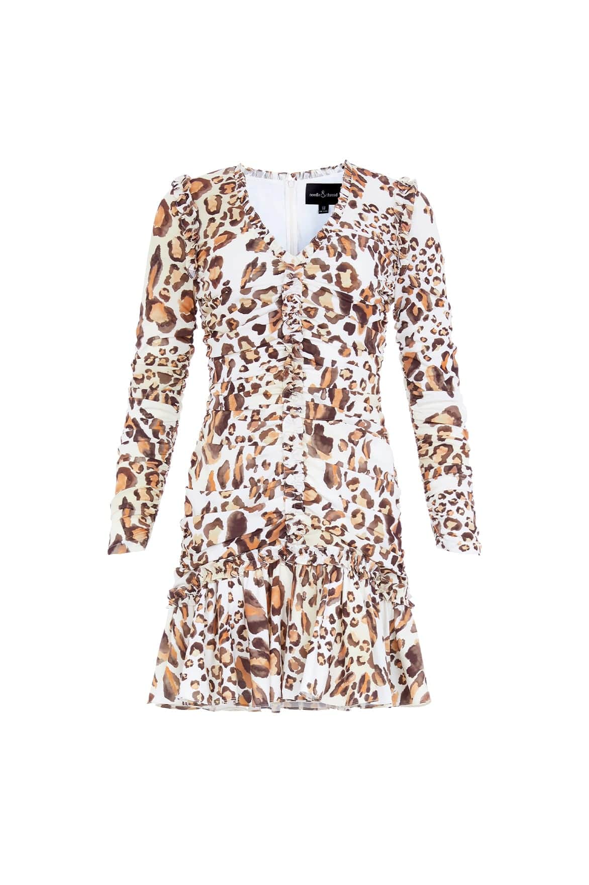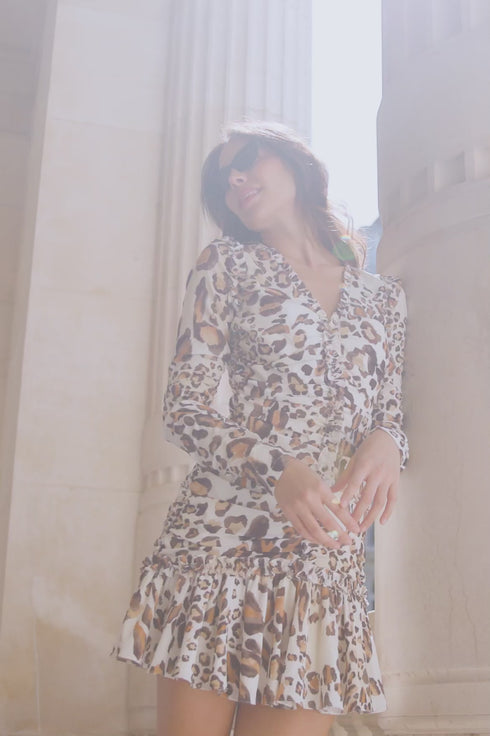 The Leopard Ellen Crepe Micro Mini Dress in Moonshine. This mini dress features a statement print that was hand-painted in-house using watercolour, with soft leopard motifs varying in scale and showcasing watery definition. Crafted from crepe fabric with stretch, it offers a flattering fit across the body. The softly gathered bodice and slim sleeves, with a gathered hem tier, provide playful styling. The V neckline is adorned with delicate Needle & Thread signature frills, adding an elegant touch. A stylish piece you'll forever treasure.