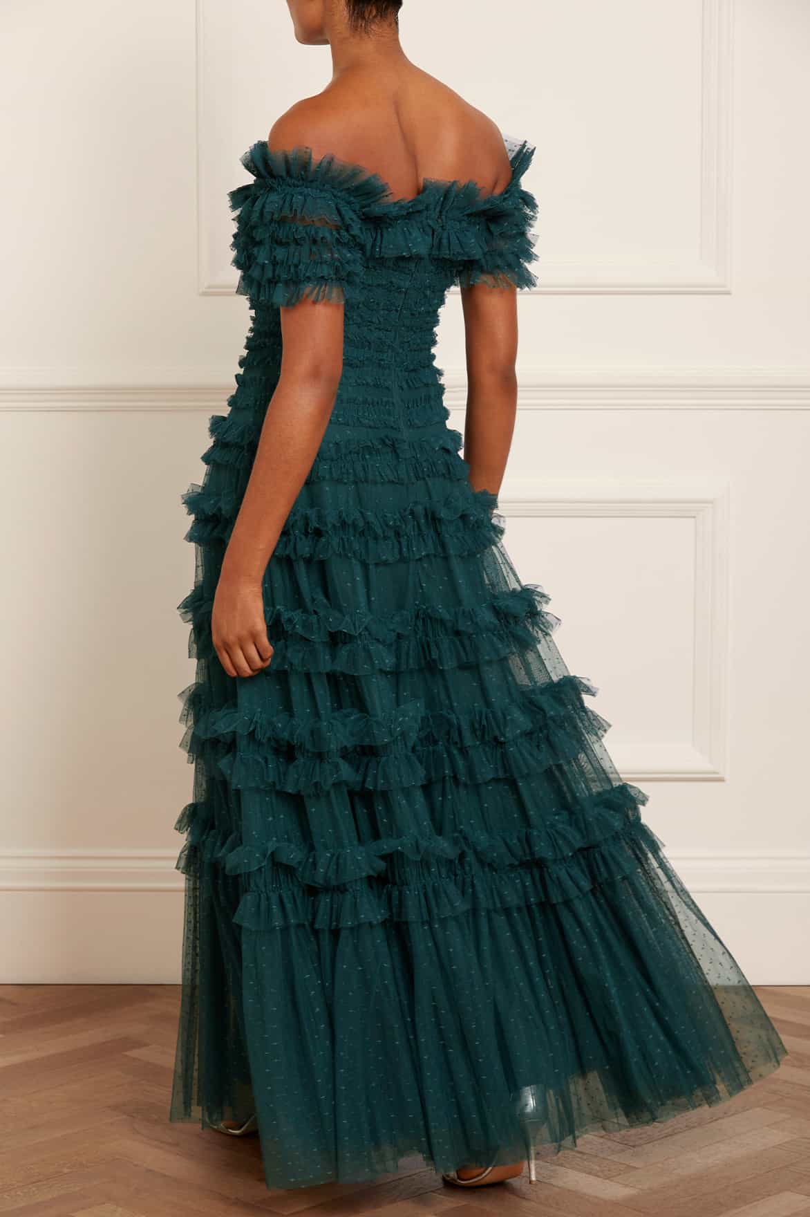 The Lisette Ruffle Off Shoulder Gown in Emerald. This statement gown has an elegant off-the-shoulder design inspired by Hollywood styling. Crafted with textile tulle and double-stitched frills for a dramatic, romantic effect. Features an integrated corset for a perfect fit and to hold the silhouette. Expect all eyes on you in this romantic gown.