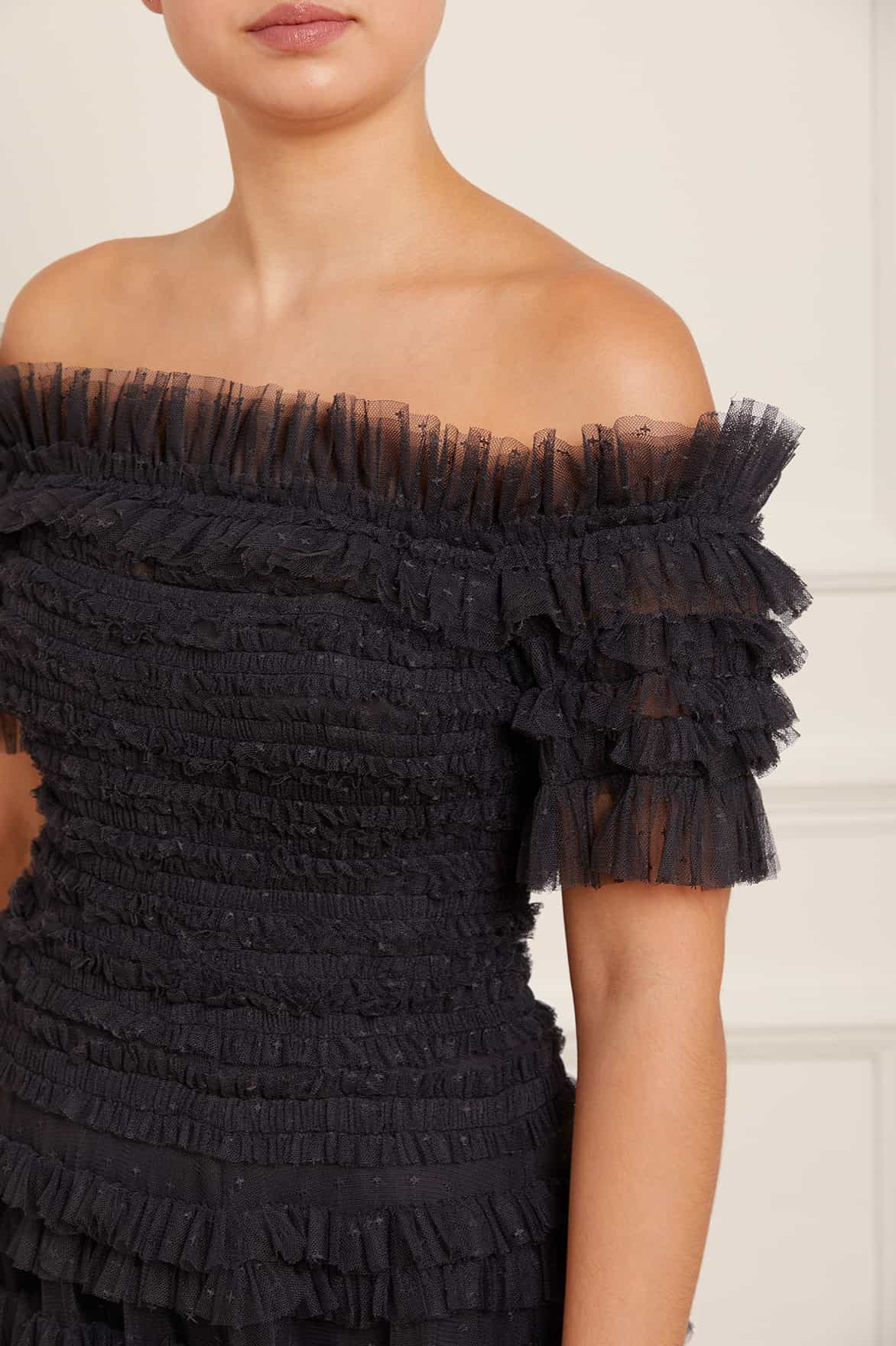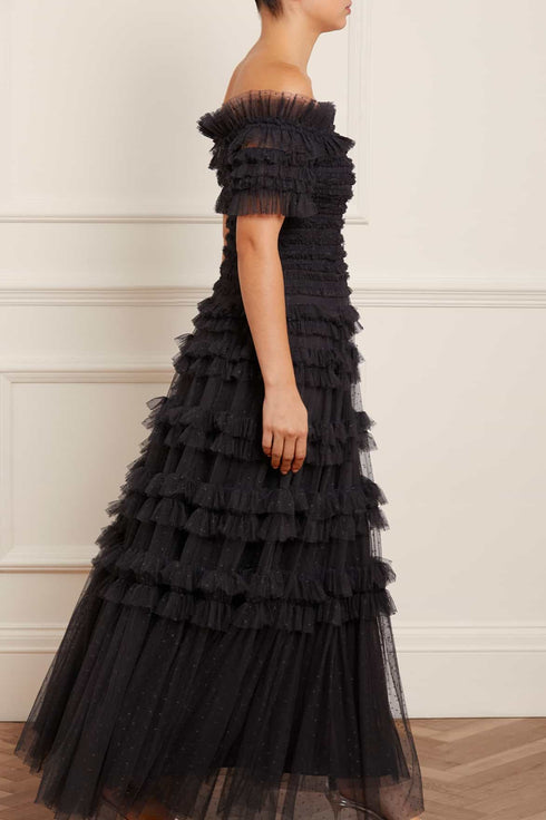 The Lisette Ruffle Off-Shoulder Gown in Graphite. This statement gown has an elegant off-the-shoulder design inspired by Hollywood styling. Crafted with textile tulle and double-stitched frills for a dramatic, romantic effect. Features an integrated corset for a perfect fit and to hold the silhouette. Expect all eyes on you in this romantic gown.