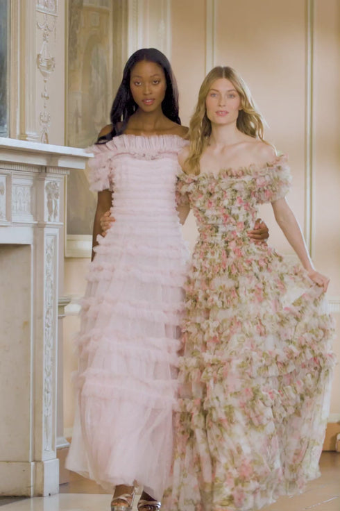 The Lisette Ruffle Off Shoulder Gown in Peony Pink. This statement gown has an elegant off-the-shoulder design inspired by Hollywood styling. Crafted with textile tulle and double-stitched frills for a dramatic, romantic effect. Features an integrated corset for a perfect fit and to hold the silhouette. Expect all eyes on you in this romantic gown.