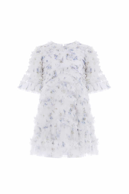 NEW SEASON. The Magnolia Ditsy Amara Ruffle Kids Dress in Moonshine/Skylight. Features whimsical ditsy florals scattered across airy tulle. With signature ruffle detailing and layered frills, this design brings romantic texture and joyful movement. This style beautifully matches the Magnolia Ditsy Gigi One-Shoulder Rouched Gown from the womenswear line for a coordinated moment.