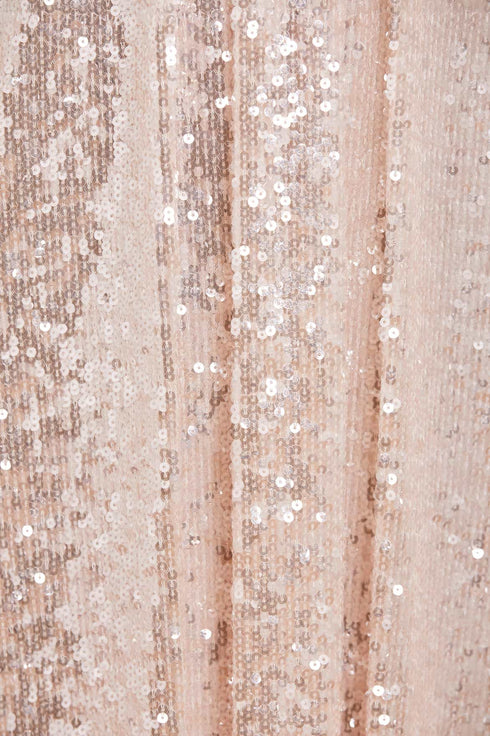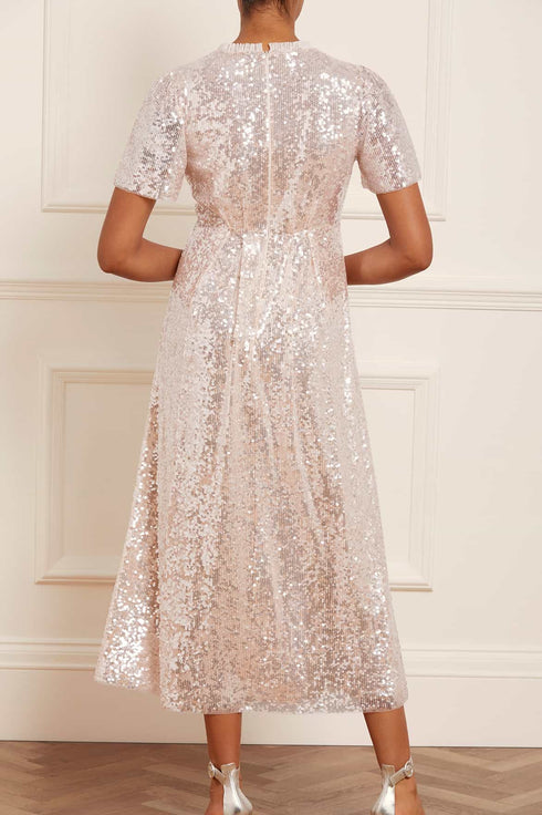 The Mila Gloss Ankle Gown in Cream. This magical piece is designed with specially sourced gloss sequins creating an extra sparkle effect. Developed with perfectly placed panels and pleats to create an effortlessly, flattering silhouette inspired by a 1930's tea dress. Make a striking appearance in the Mila.