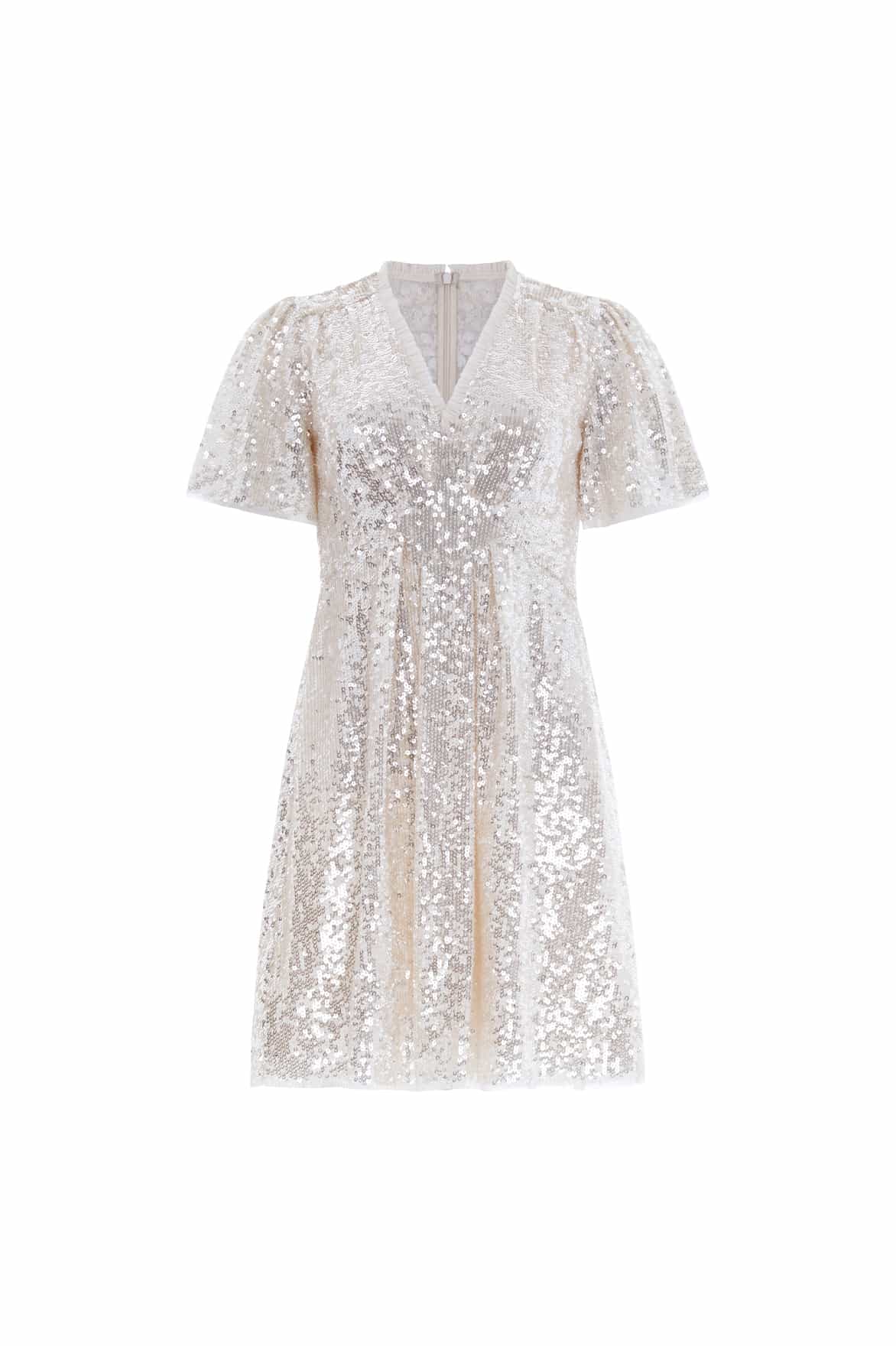 The Mila Gloss Mini Dress in Cream. This magical piece is designed with specially sourced gloss sequins creating an extra sparkle effect. Developed with perfectly placed panels and pleats to create an effortlessly, flattering silhouette inspired by a 1930's tea dress. Make a striking appearance in the Mila.