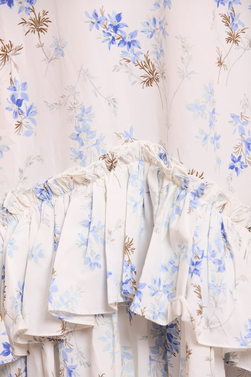 - Floral printed crepe decorated with printed ruffles