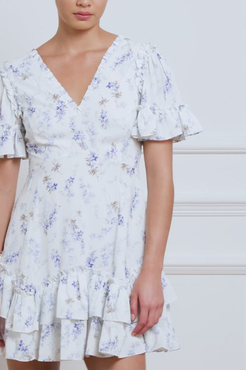 The Ophelia Ditsy Eva Crepe Micro Mini Dress in Moonshine/Blue. This dress features a beautiful, romantic trailing print taken from an archive, hand-painted artwork from the early 1900s, depicting soft, whimsical ditsy floating florals. Inspired by 1930s tea dresses, it is adorned with elegant frills and offers an effortless, flattering fit with a V-shaped waist seam. The romantic fluted sleeves are detailed with frills, making this dress perfect for any occasion. The perfect piece to take you from day to night.