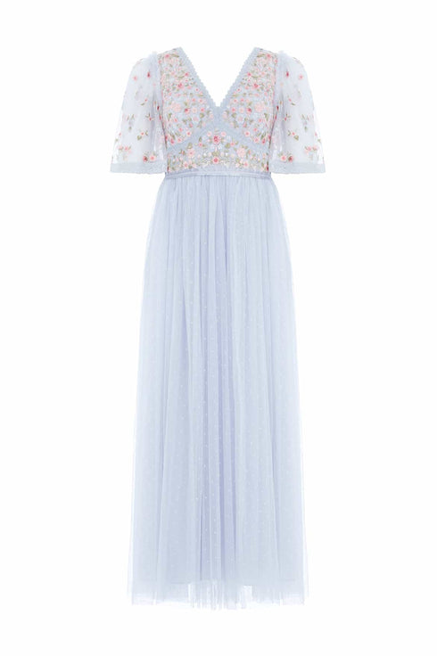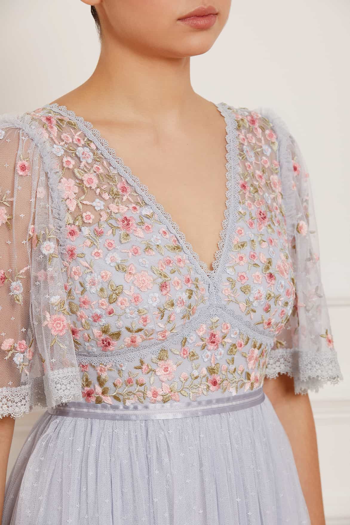 The Ribbon Bouquet Bodice Ankle Gown in Blue / Pink Multi. The bodice of this gown is intricately designed with embroidered bouquets of flowers in rich tones, inspired by a 1930s vintage print. Beautifully adorned with delicate lace trims for signature Needle & Thread detailing. The skirt features layers of tulle to create a romantic silhouette. The perfect gown for an upcoming occasion.