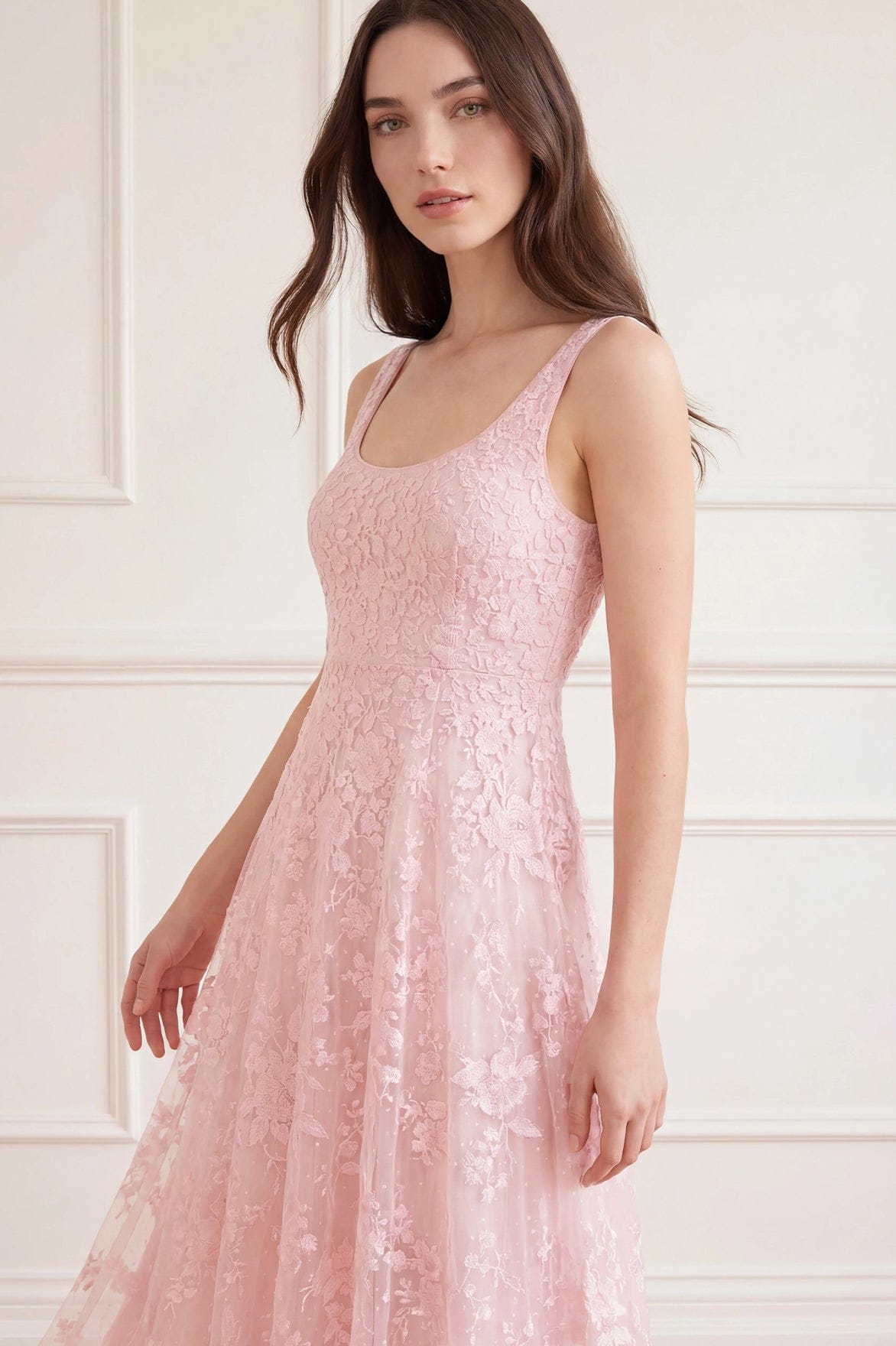 NEW SEASON. The Rosa Sleeveless Scoop Neck Ankle Gown in Powder Lilac/Peony Pink. This elegant gown features signature floral embroidery inspired by garden blooms, arranged across a sleeveless silhouette. Finished with a scoop neckline and flowing ankle-length skirt for soft, feminine movement.