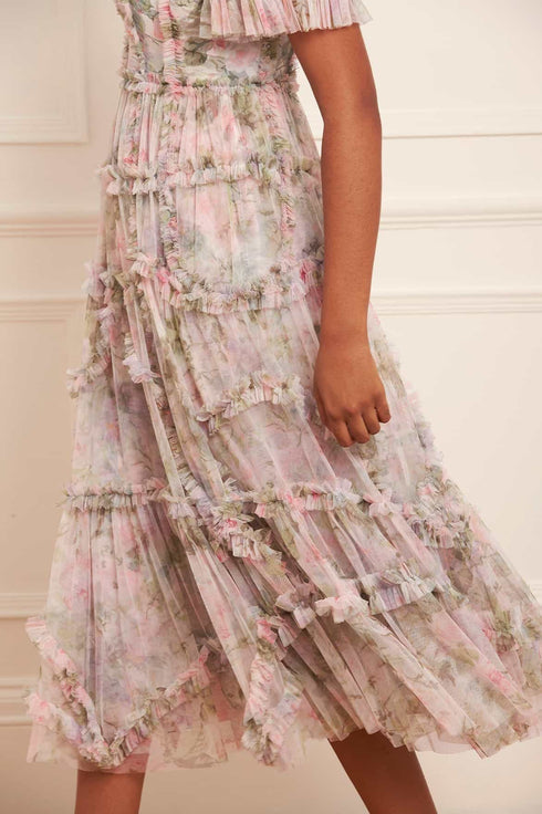 The Rose Powder Ruffle Ballerina Dress in Moonshine. This dress is inspired by a 1900s hand-painted wallpaper design. Beautifully printed with florals in faded pastels for a vintage look. This dress is crafted with signature Needle & Thread styling featuring tulle ruffles and layers of delicate tulle, creating pretty, effortless movement. A wardrobe treasure you'll forever hold onto.