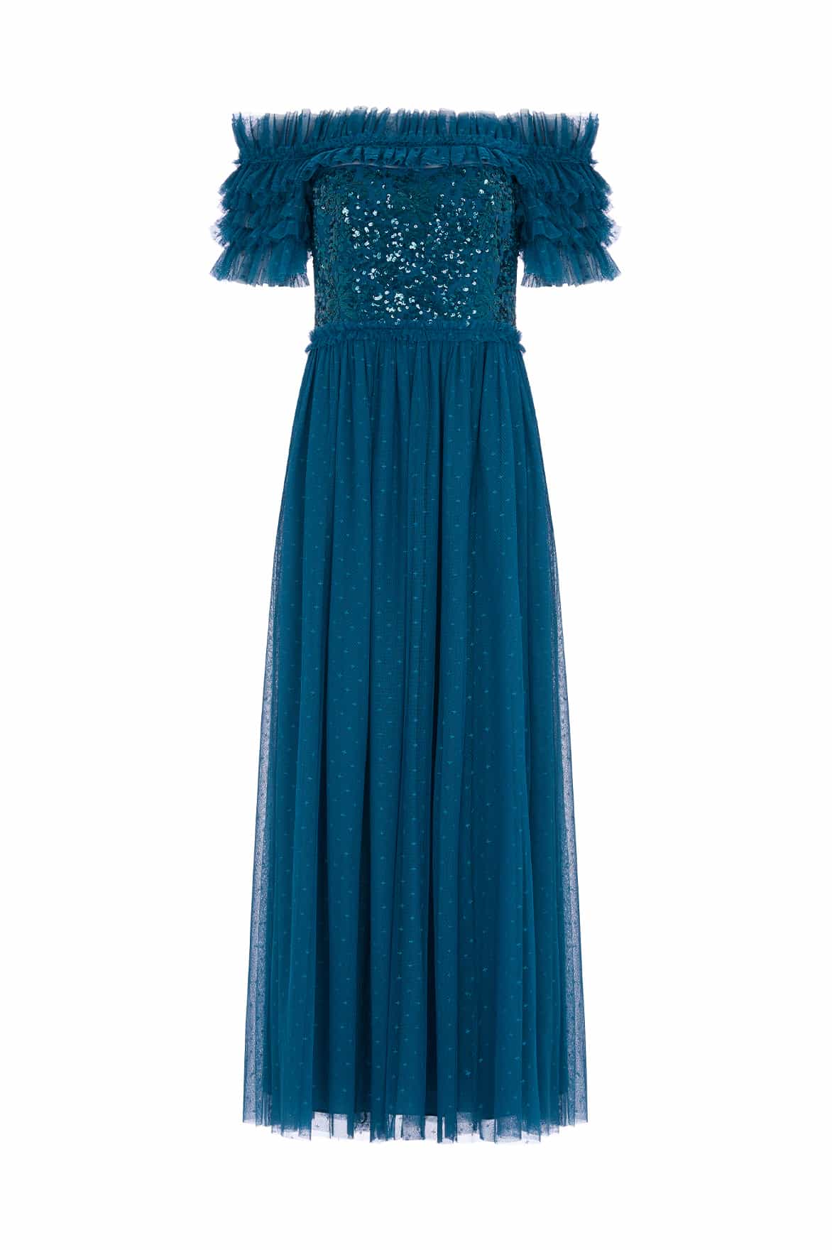 The Sequin Wreath Bodice Off-Shoulder Ankle Gown in Teal. This beautiful gown is crafted with an iconic off-the-shoulder design. Adorned with layers of delicate ruffles, along with an elasticated panel for comfort and hold. The bodice is beautifully decorated with shimmering sequins inspired by a vintage lace curtain. Designed with a romantic layered tulle skirt for signature Needle & Thread styling. A perfect gown for a special occasion.