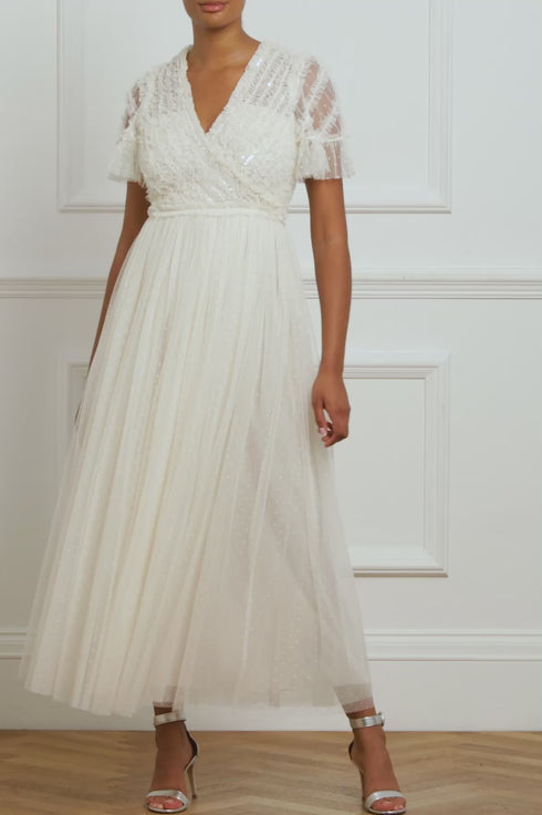 The Spiral Sequin Bodice V-Neck Ankle Gown in Cream. A brand new style for the season ahead. This gown is elegantly designed with a V-neckline. Beautifully adorned with delicate tulle frills and a layered tulle skirt for a frothy, romantic texture. The bodice of the gown is designed with gathered, spiral texture and intricate, shimmering sequins adorning each individual frill. This gown is perfect for a bridesmaid moment or upcoming special occasion.