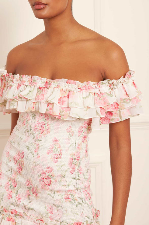 The Summer Posy Chiffon Smocked Micro Mini Dress. Beautifully designed with a perfect summer print taken from a hand-painted artwork from the early 1900s. This mini dress is decorated with pretty posy, floral clusters scattered and dispersed throughout to create an all-over beautiful print. Developed in soft chiffon with a fully stretch elasticated smocking body, adding vintage-inspired detail. Developed with an off-shoulder elasticated design featuring layers of chiffon to create comfort and signature Needle & Thread detailing. The skirt panels are created using layers of chiffon staggered in length to create a playful, frothy silhouette. A piece you'll forever treasure.