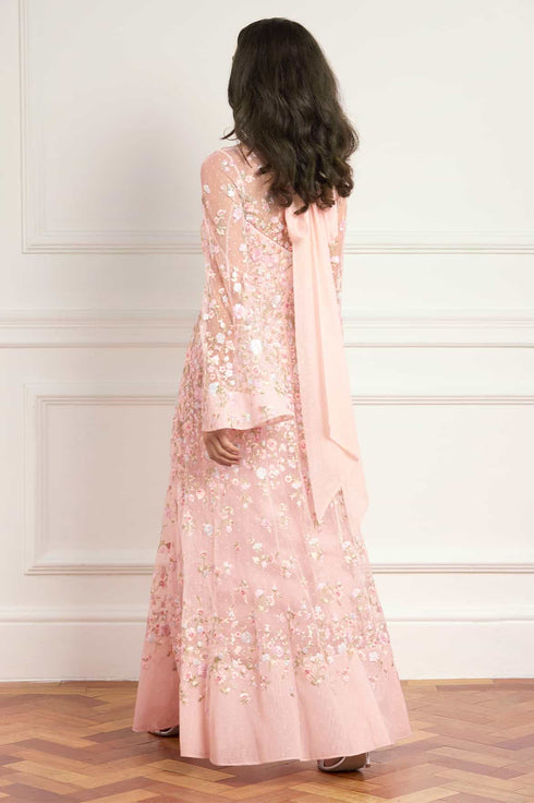 NEW SEASON. The Sylvia Rose Long Sleeve Ankle Gown in Peony Pink/Bright. Adorned with delicate floral embroidery cascading in softly graduated bands, this gown offers a romantic, engineered finish. Designed with long sleeves and an elegant ankle-length silhouette for refined occasion dressing.