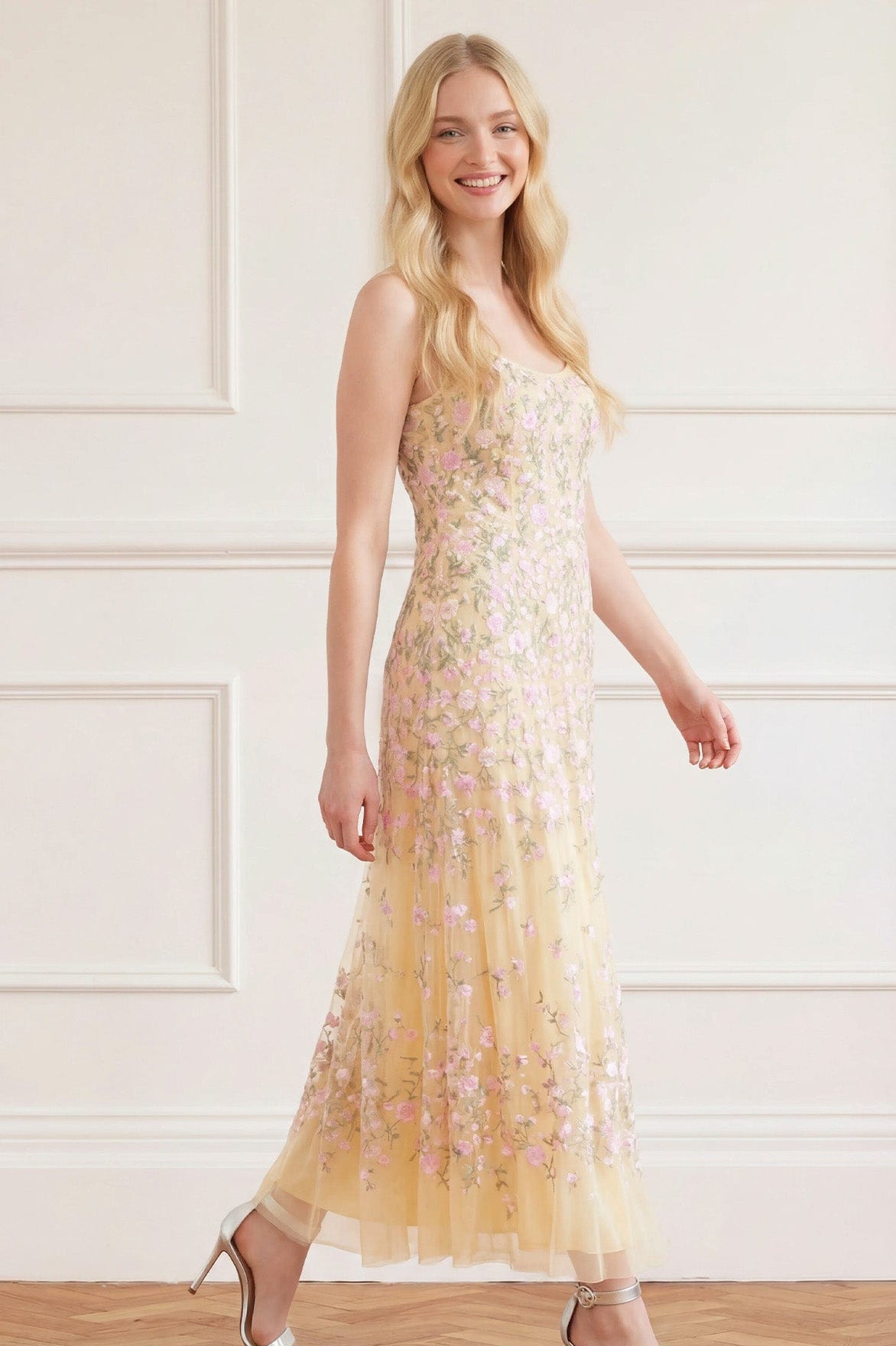 NEW SEASON. The Sylvia Rose Scoop Neck Ankle Gown in Lemon Sorbet/Pastel. An elegant embroidered gown featuring delicately engineered panelling for a flattering fit. Designed with a scoop neckline and a slim powermesh lining to gently enhance the silhouette with comfort and structure.