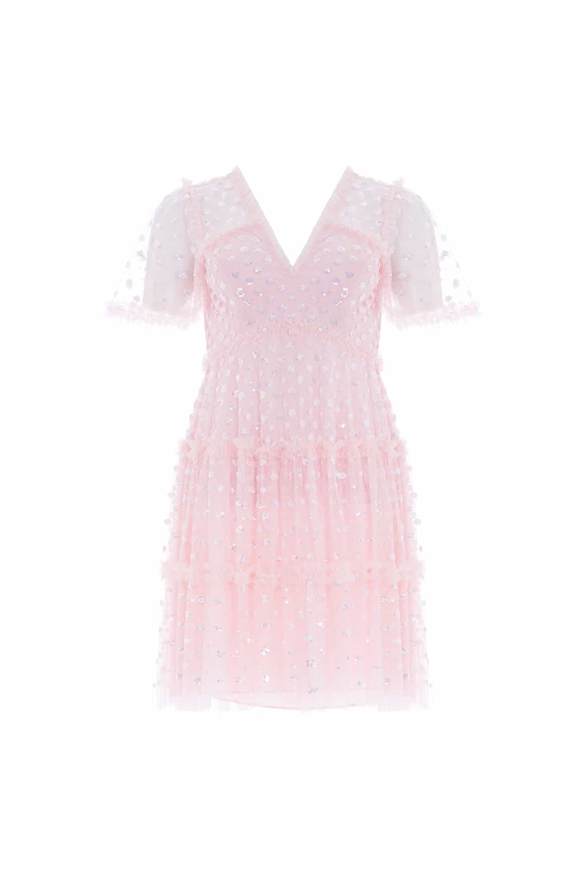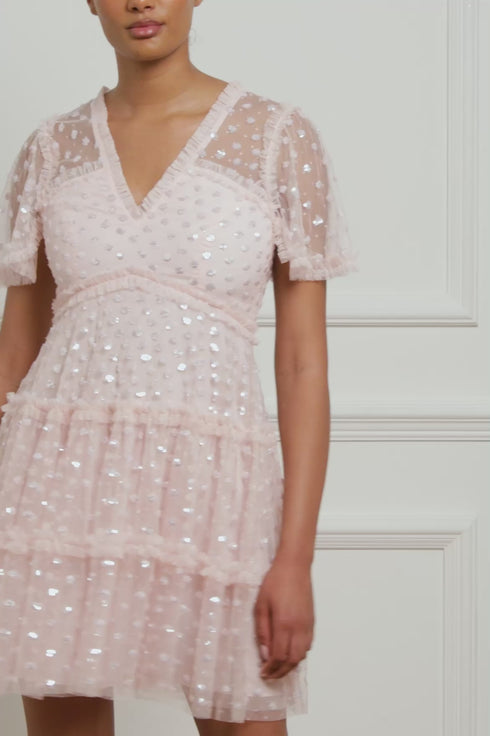 The Thea Mini Dress in Dusk Pink. This mini dress is scattered with polka dot sequin motifs to create an enchanting shimmer throughout. Developed with signature Needle & Thread 'x' motif tulle adding subtle detail. Make a special appearance in the Thea at your next event.