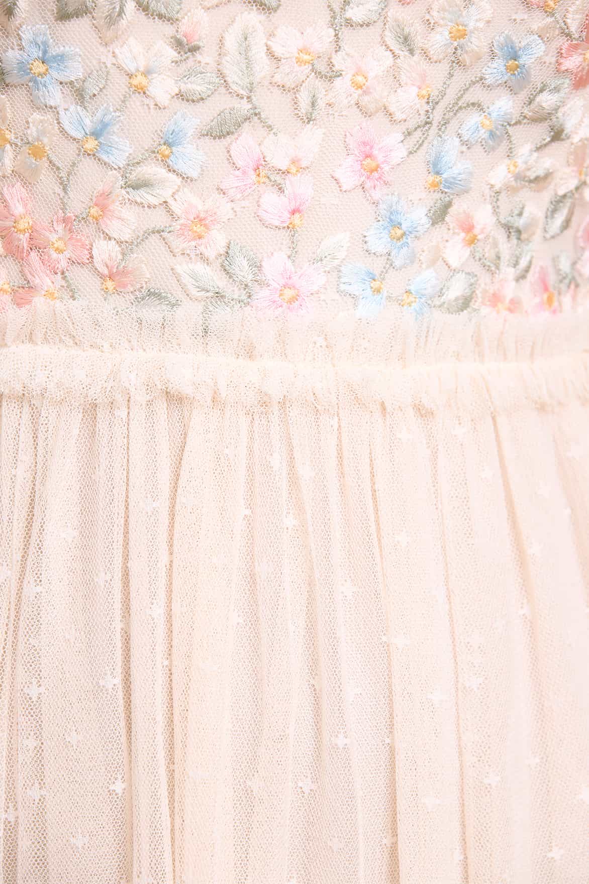 The Versailles Ditsy Bodice Ankle Gown in Cream. Inspired by the opulent interiors of the Palace of Versailles, this enchanting gown features intricate multicoloured floral embroidery, densely stitched across the bodice and softened with delicate ditsy motifs along the sleeves. The short sleeves are finished with a fine lace trim, adding a touch of vintage elegance. A square neckline and waist are adorned with signature Needle & Thread tulle frills, enhancing the gown's romantic charm. The skirt cascades in layers of soft, voluminous tulle, creating graceful movement and timeless femininity.