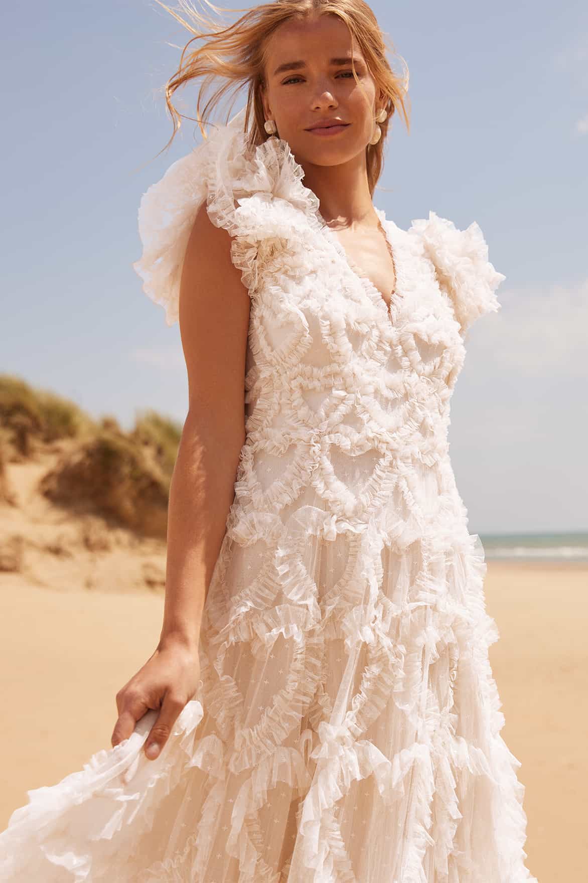 The Amorette V-Neck Gown in Cream. A signature Needle & Thread style; beautifully adorned with our key love heart motif, made from gently gathered delicate tulle. Designed with romantic, frothy sleeves created using layers of delicate tulle and frills for a statement look. Featuring a generously voluminous skirt layered with tulle and net for a full, magical silhouette. A textile piece you'll forever treasure.
