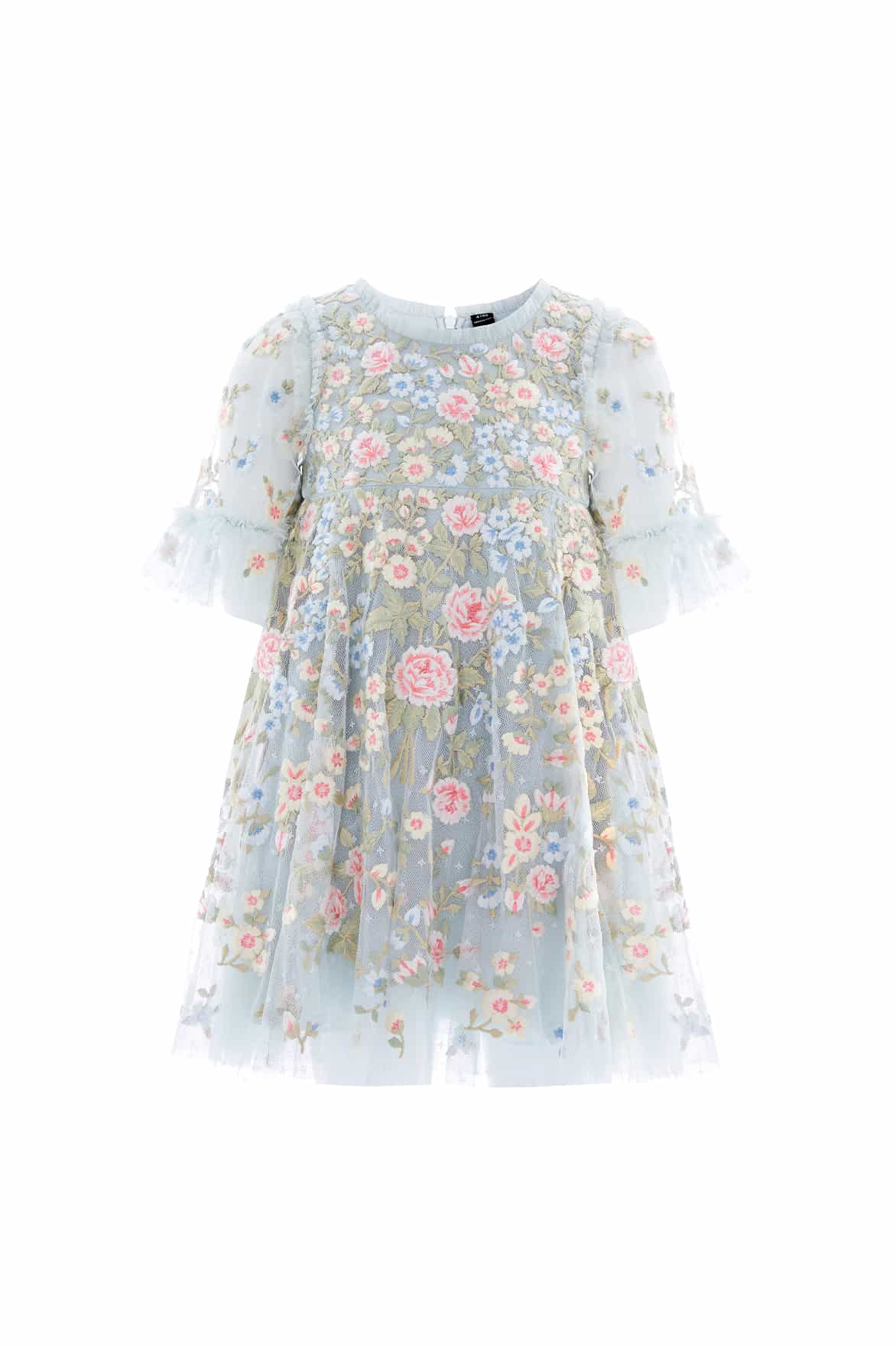 The Antoinettes Floral KIDS Dress in French Blue. Inspired by the opulent interiors of the Palace of Versailles, this enchanting dress features intricate multicoloured floral embroidery, with luxurious bouquets cascading delicately toward the hem. Designed with short fluted sleeves with frill cuffs and signature Needle & Thread tulle frills at the neckline and shoulders add romantic detail. The voluminous skirt, crafted from generous layers of net and tulle, is made for twirling—perfect for any special moment.