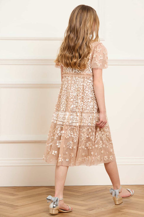 The Aurora KIDS Dress in Butterscotch/Cream. A heritage style from the Needle & Thread archive, inspired by early 1900s antique tablecloths. Crafted with intricate sequin embroidery and signature tulle frills at the neckline, waist, and sleeves. Finished with a soft, layered tulle skirt for elegant movement. A dreamy fairytale dress that will make them feel like a true princess.