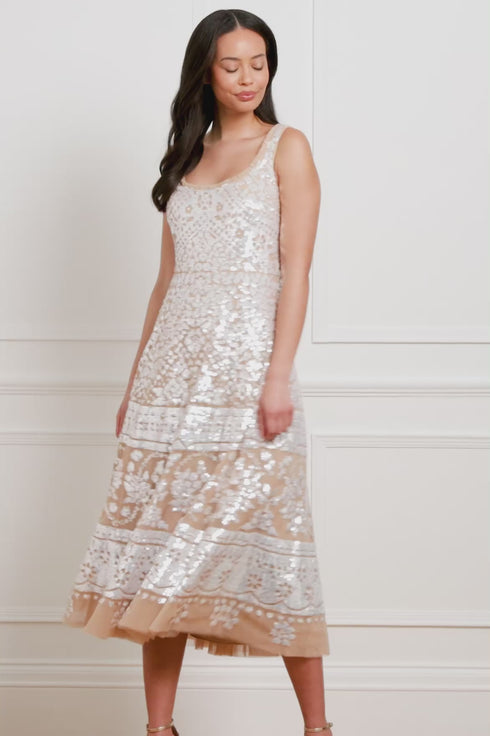 The Aurora Scoop Neck Ballerina Dress in Butterscotch/Cream. Inspired by antique tablecloths from the early 1900s, this dress features a beautifully intricate placement border design, embellished with countless shimmering sequins. The elegant silhouette is framed by a round neckline and slim long sleeves, while signature Needle & Thread tulle frills accent the neckline and armholes for a delicate, feminine finish. A full, layered tulle skirt completes the look—perfect for creating a romantic statement at any special occasion.