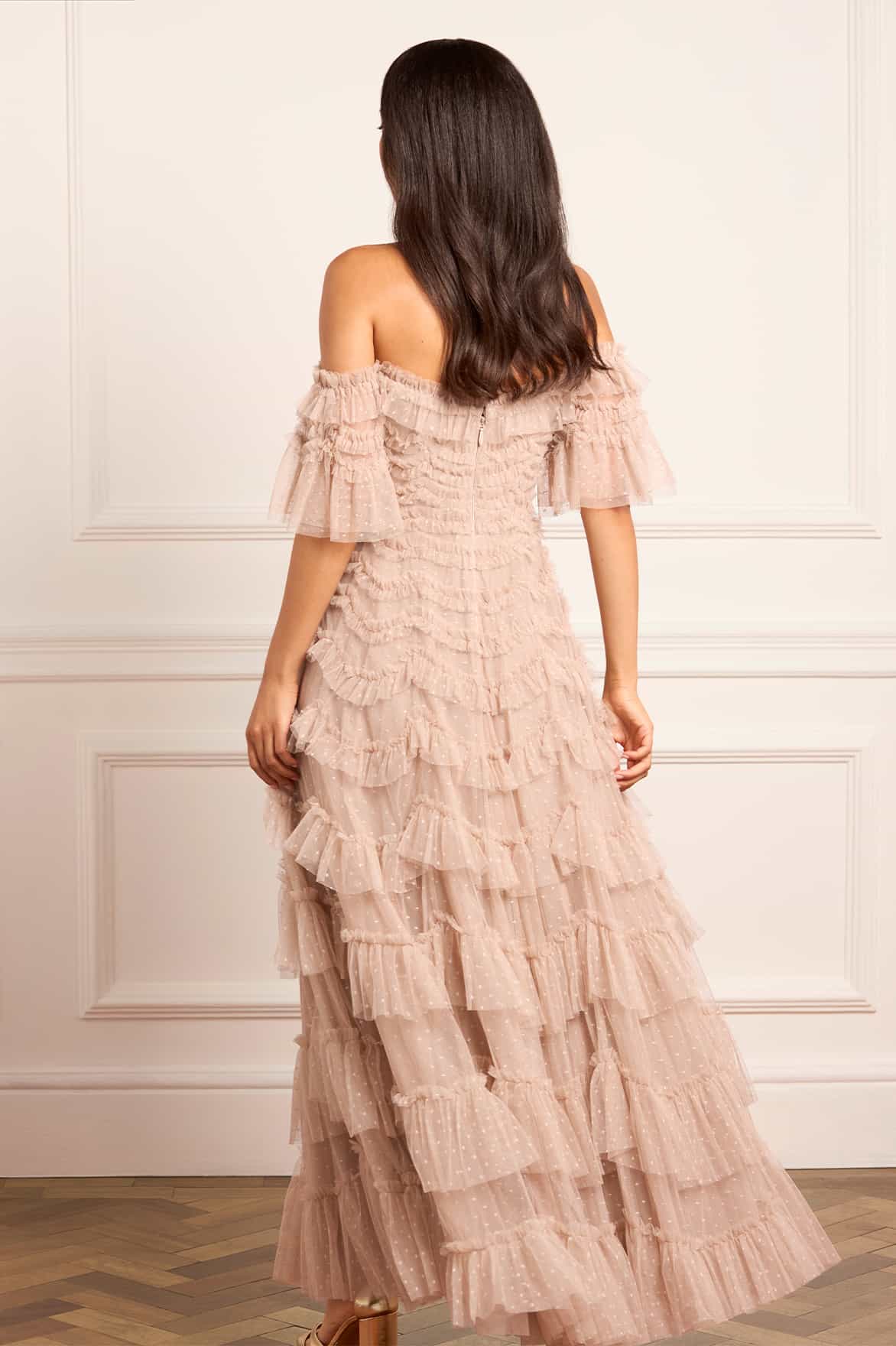 NEW SEASON. The Aviana Off-Shoulder Gown in Sandstone. Drawing from the celestial themes of the Bright Star collection, this gown channels soft romance through rows of delicately topstitched gathered tulle. The scallop frills graduate toward the hem, creating movement and frothy dimension.