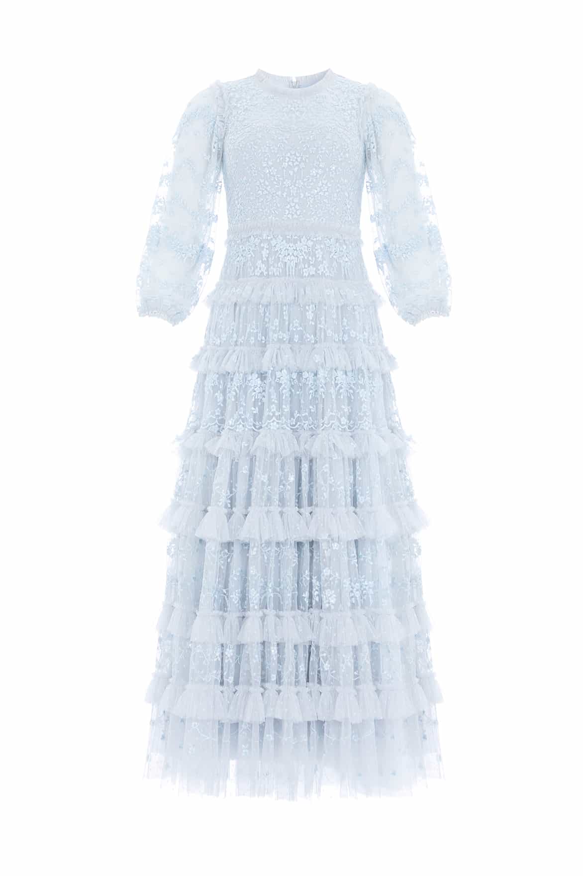 -Form fitted through the bodice with a relaxed fit through the sleeve and a multi-tiered full skirt