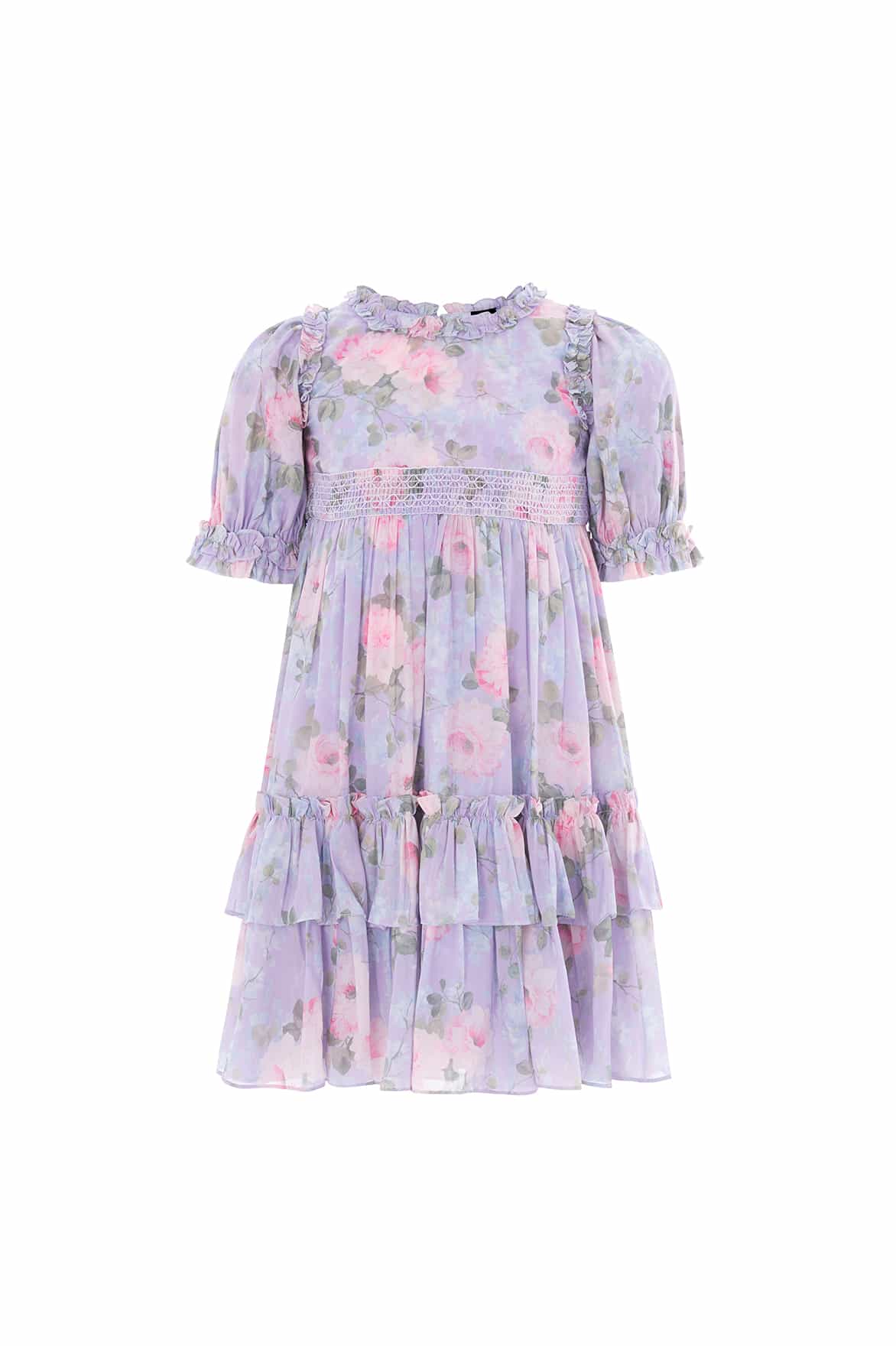 NEW SEASON. The Camille’s Garden Chiffon Smocked Kids Dress in Lavender Crafted from airy chiffon printed with soft floral motifs. Designed with a smocked bodice and gentle ruffles, this style pairs perfectly with the Camille’s Garden Round Neck Ballerina Dress from the womenswear line for a beautifully coordinated ensemble.