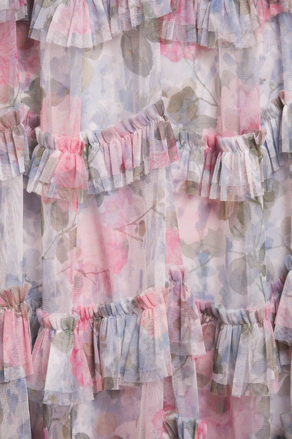 - Floral printed tulle decorated with layers of tulle ruffles.