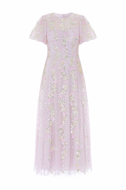 NEW SEASON. The Confetti Round Neck Ankle Gown in Powder Lilac/Multi. This romantic gown features delicate floral sequin artwork that gently disperses towards the hem for a soft, ethereal effect. Designed with a round neckline and flowing ankle-length skirt for effortless elegance.