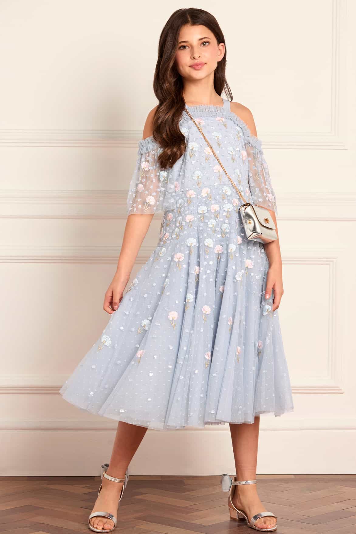 NEW SEASON. The Dandelion Ditsy Off-Shoulder Kids Dress in Skylight. Crafted from soft tulle featuring ditsy embroidered florals. With an off-shoulder neckline and a twirl-ready skirt, it’s a whimsical choice for joyful occasions. This design pairs beautifully with the Dandelion Ditsy Ankle Gown from the womenswear line for a coordinated occasion look.