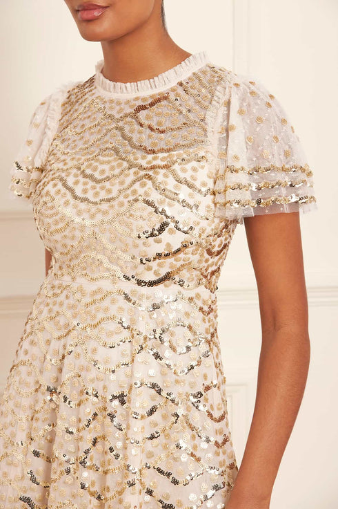 The Deco Dot Gloss Ankle Gown in Cream / Gold. Created with beautiful artwork inspired by 1930’s art deco styling. This gown features exquisite, high-shine sequins featuring an extra foil coat finish for an ultra-shimmering effect. Developed with layered tulle sleeves with a sequin border edge for a romantic look. Expect all eyes on you in this statement piece.
