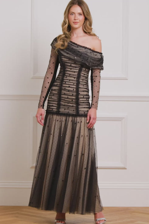 The Gigi Dot One-Shoulder Rouched Gown in Graphite/Beige. A refined take on modern draping, featuring dotted tulle with ruching through the body and a one-shoulder neckline, this gown elongates and flatters. Add a touch of romance to a sophisticated look.