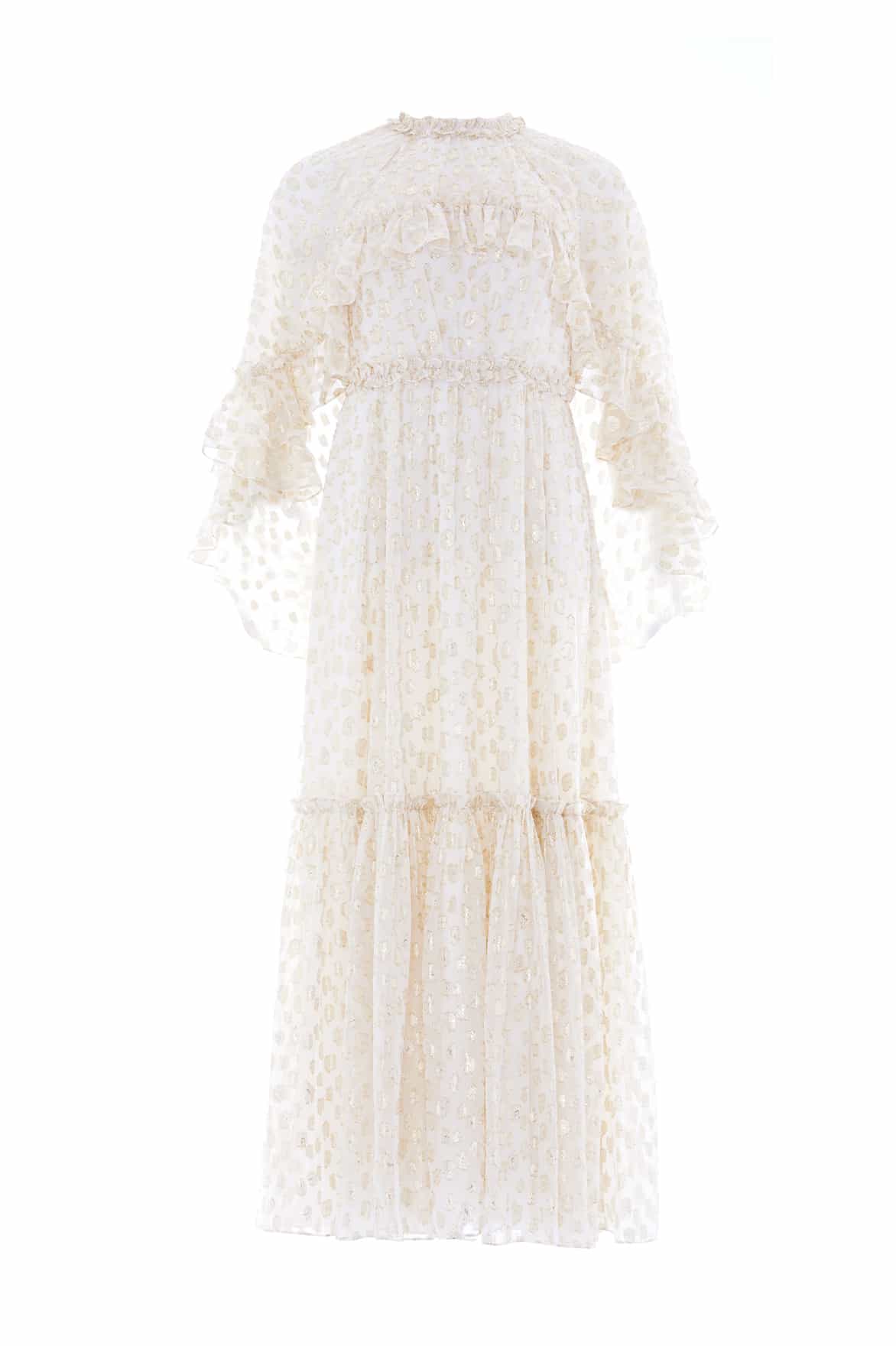 The Harper Lurex Cape Ankle Gown in Cream. Crafted in luxurious glittering gold lurex georgette fabric, this gown features a delicate, subtle leopard print motif that adds an understated touch of drama. The dramatic cape, with a detachable fastening, offers versatile styling options, while the soft chiffon creates a romantic, flowing silhouette. Perfect for transitioning seamlessly from day to night.
