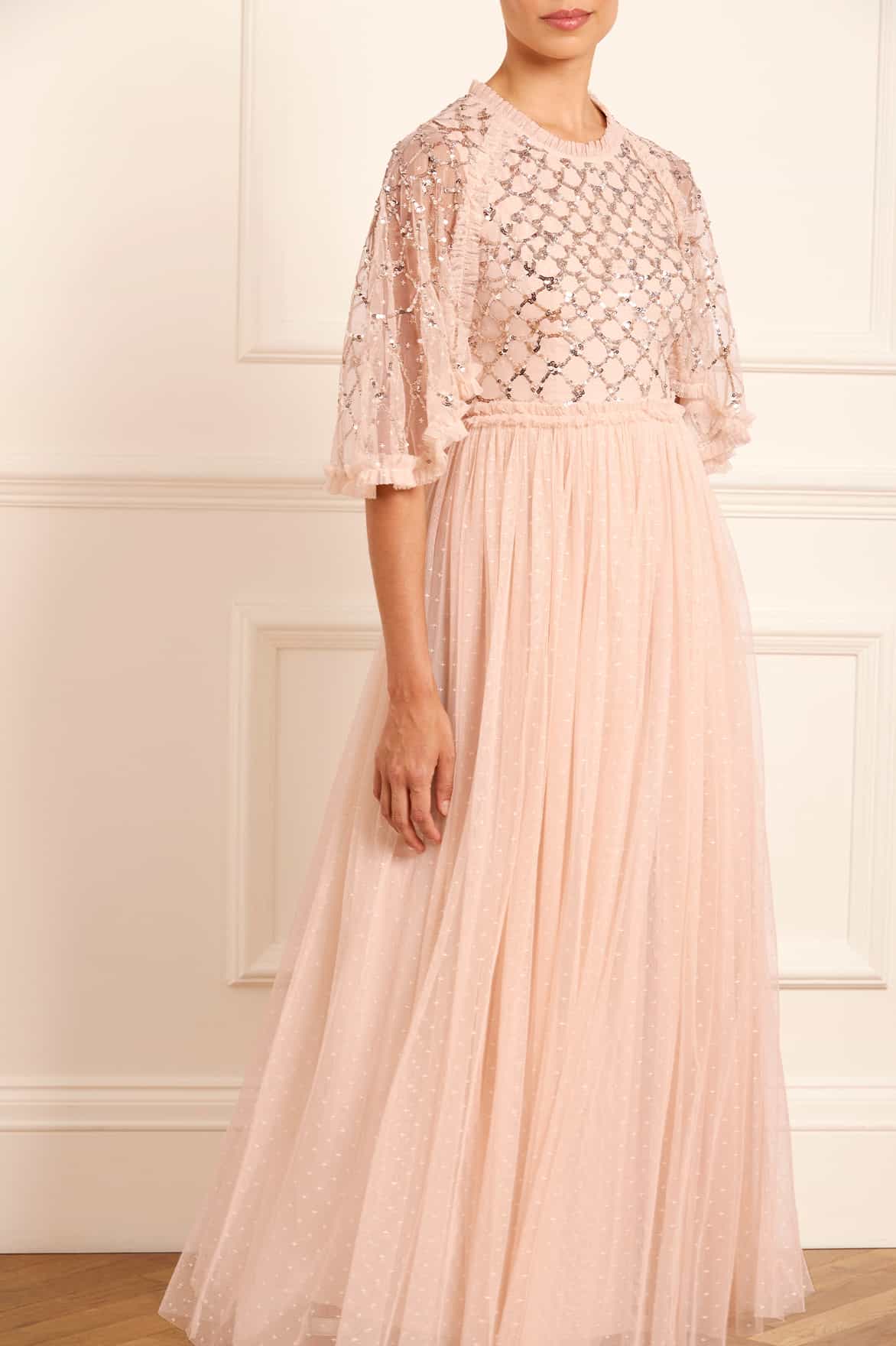 The Heart Lattice Bodice Cape Ankle Gown in Dust Beige/Silver. The bodice of the gown is decorated with intricate embellishments made using the smallest sequins for exquisite detailing. Beautifully designed with heart-shaped motifs in a lattice layout. Developed with signature Needle & Thread soft tulle trims and a layered skirt for romantic detailing and a statement look. The perfect gown for a bridesmaid moment or an upcoming special occasion.