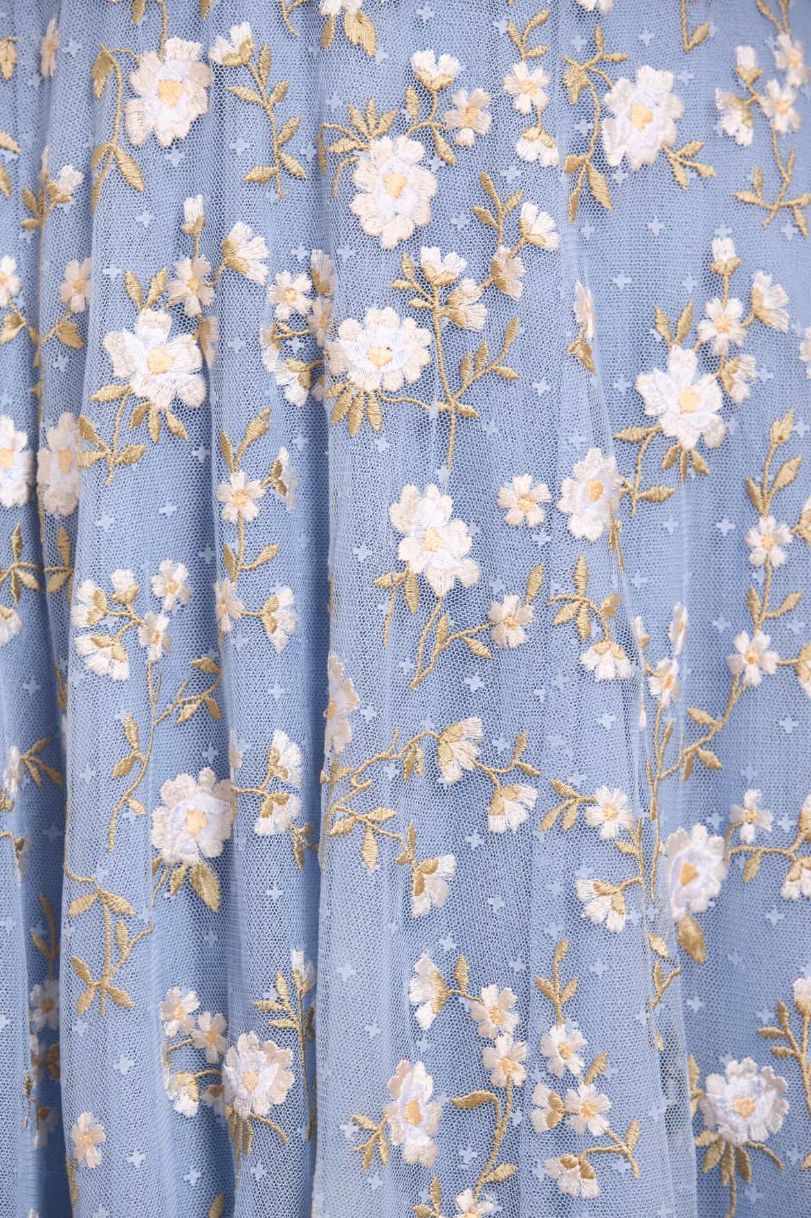 - Kisses tulle decorated with floral embroidery.