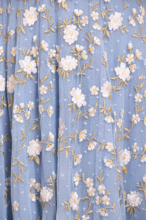 The Lea Ditsy One-Shoulder Ankle Gown in Sky Blue/Cream features delicate floral embroidery inspired by a 1900s painting. The off-the-shoulder design adds elegance, while the skirt is made of layered tulle with statement frills for a romantic touch. The perfect gown for your next special event.