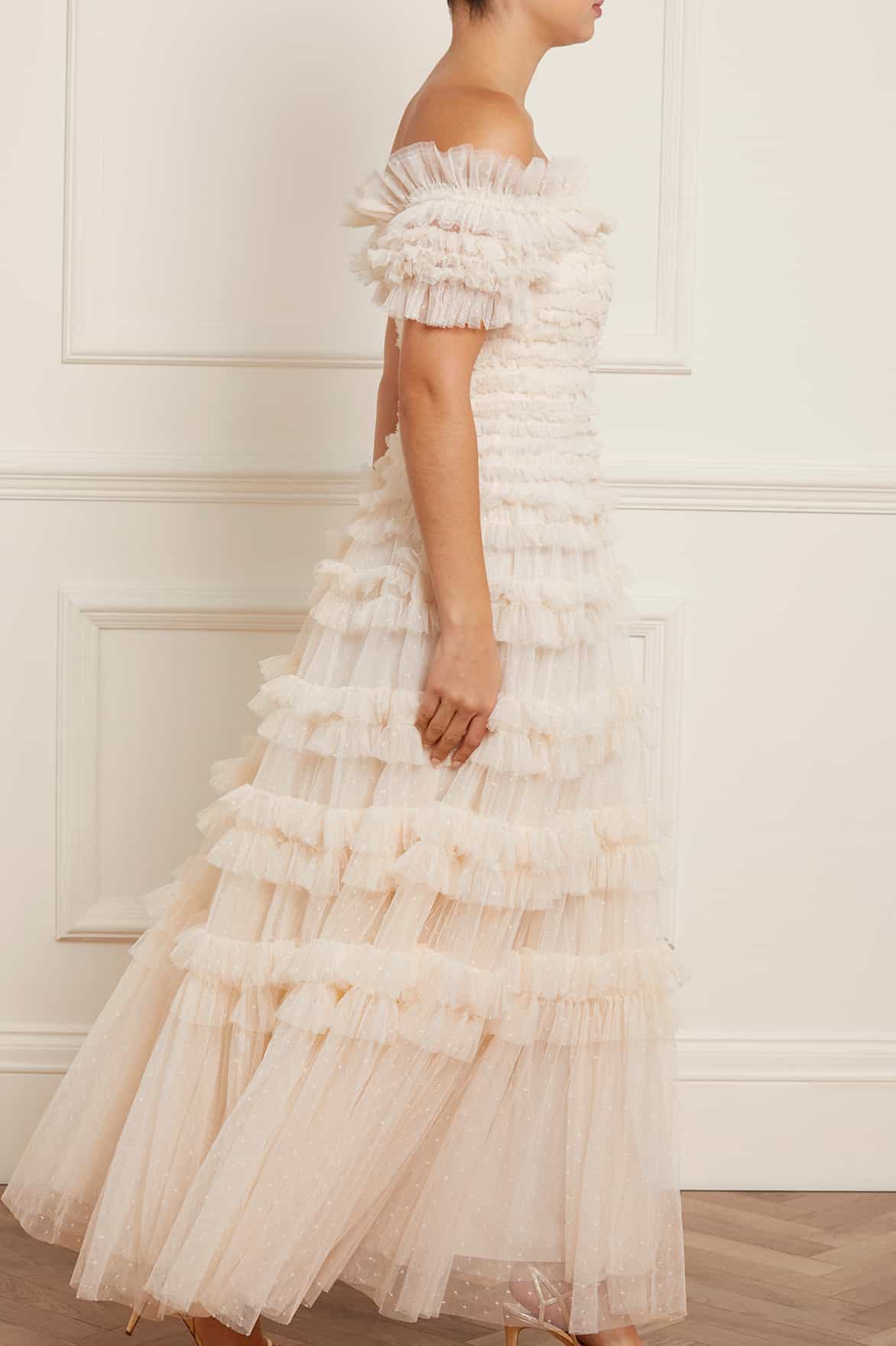 The Lisette Ruffle Off Shoulder Gown in Champagne. This statement gown has an elegant off-the-shoulder design inspired by Hollywood styling. Crafted with textile tulle and double-stitched frills for a dramatic, romantic effect. Features an integrated corset for a perfect fit and to hold the silhouette. Expect all eyes on you in this romantic gown.