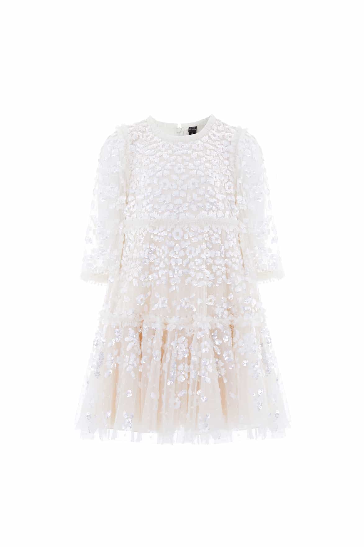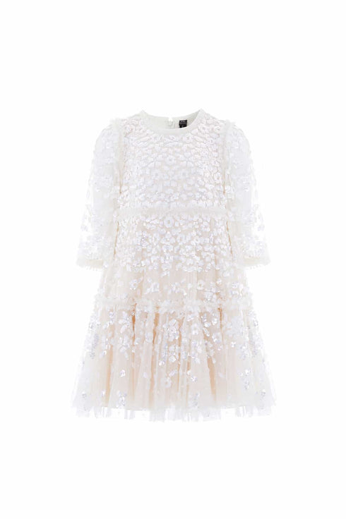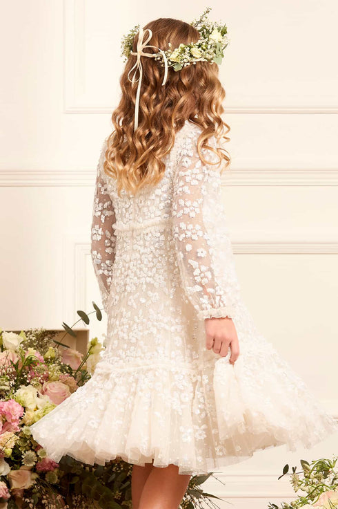 NEEDLE & THREAD EXCLUSIVE. The Maeva Long Sleeve Kids Dress in Cream is a Needle & Thread exclusive, featuring floral sequin motifs on the bodice and trailing floral borders fading towards the hem. Designed with foil-coated sequins add a lustrous shine, while the gathered skirt tier with a frothy ruffle gives it volume for twirling. Delicate tulle frills at the neckline, shoulders, and yoke complete this timeless, heritage-inspired design.