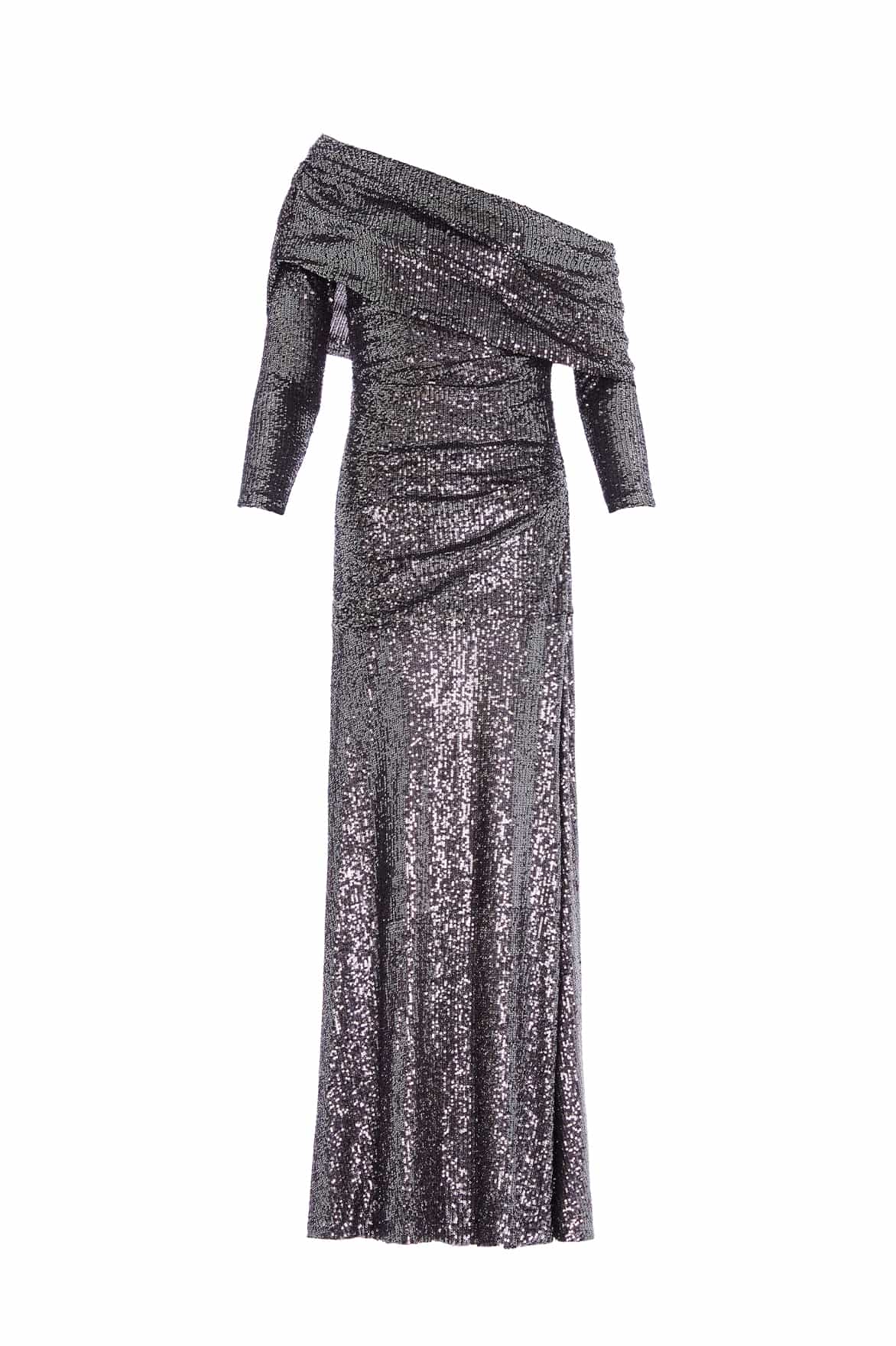 The Nova One-Shoulder Ankle Gown in Gunmetal. This gown is inspired by vintage Hollywood glamour. Beautifully designed with an elegant off-the-shoulder structure. Adorned all over with tiny glittering sequins for the ultimate statement. Crafted with a slim silhouette enhanced by soft drapes across the body, leading to a fluid sweeping skirt. The perfect romantic style for an upcoming special occasion. We hope you adore this new style as much as we do at Needle & Thread head office.