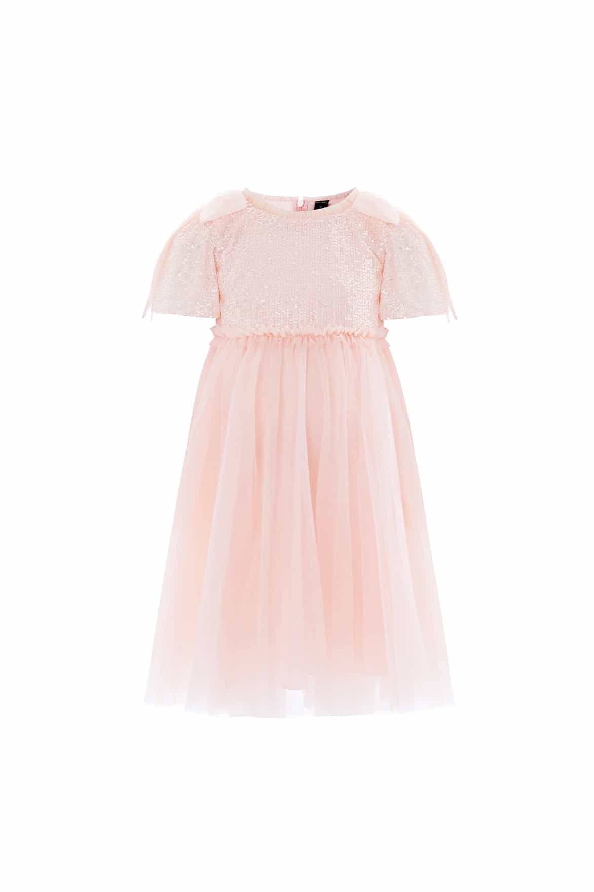 NEW SEASON. The Paloma Bow Kids Dress in Seashell. A charming design crafted in layers of soft tulle. Finished with a beautiful bow and a full skirt, it captures classic Needle & Thread femininity in miniature form.